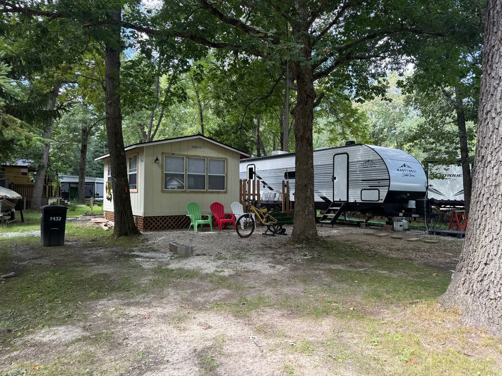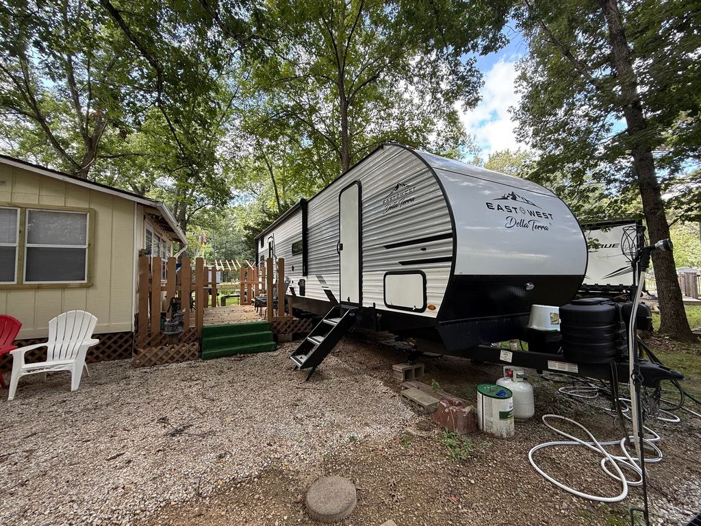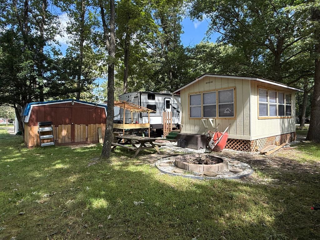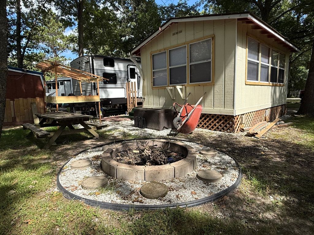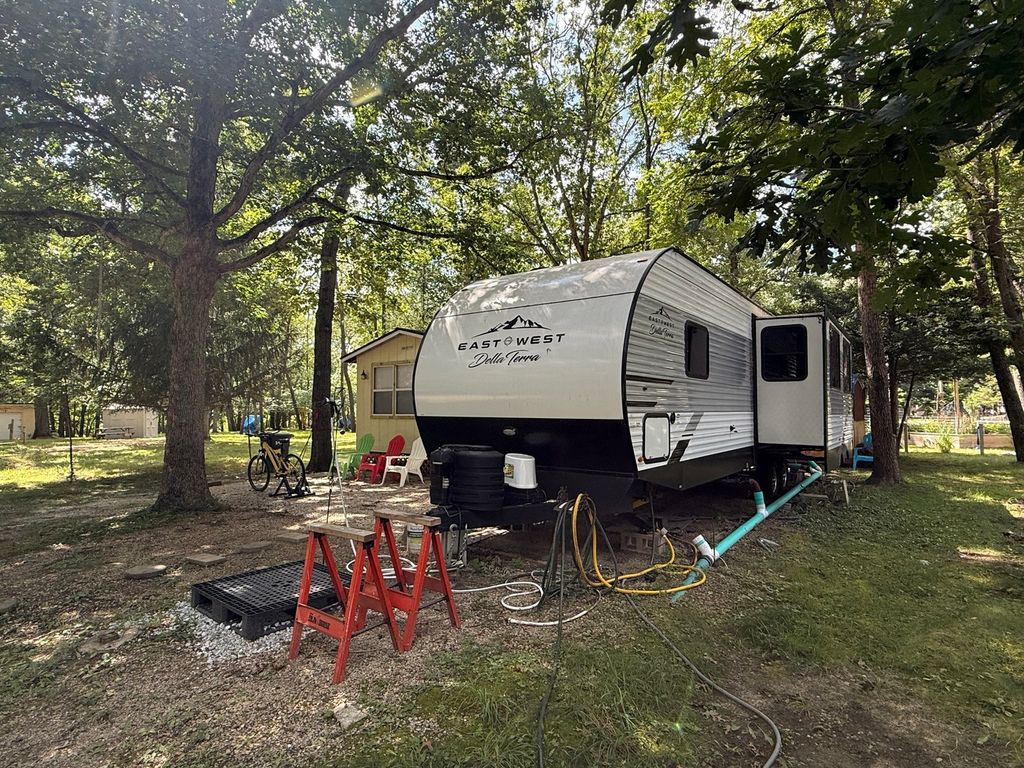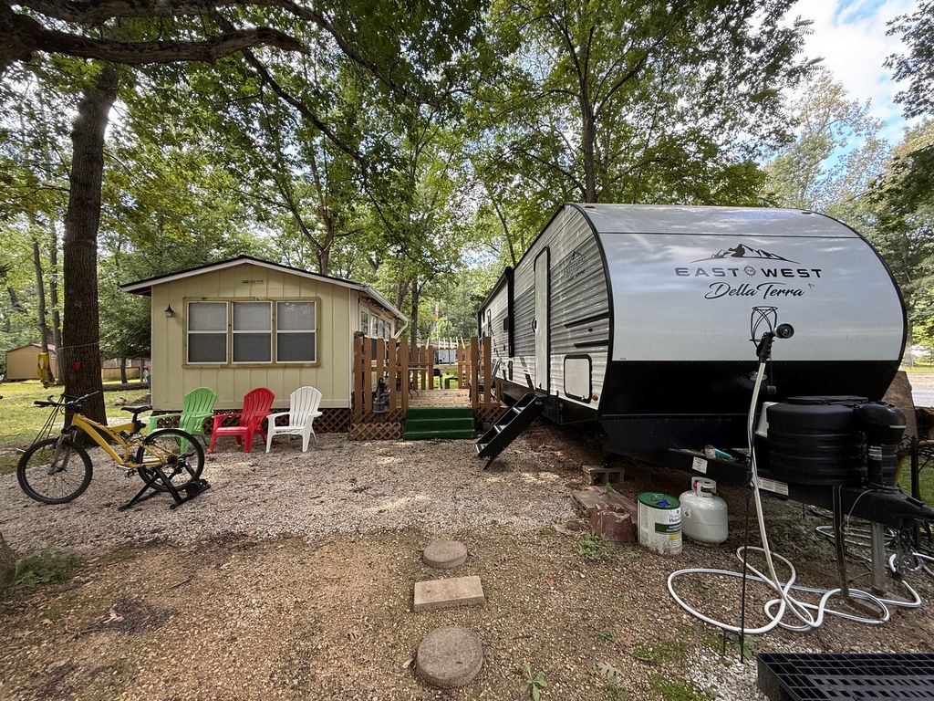 Stunning 2024 East to West Della Terra 300DB Travel Trailer, perfectly set up on a shaded, level lot near Bass Lake, Sunset Lake, the comfort station, and other great amenities. This modern travel trailer features beautiful finishes throughout and comes fully equipped with all appliances, plus two LP tanks for extended use. With plenty of room to sleep family and guests, the layout includes a private main bedroom, a bunk room, a converting dinette, a sofa, and a spacious room addition with new carpet and fresh paint (2025), offering even more sleeping space. For added convenience, the unit includes 1.5 bathrooms-one at each end. Outside, enjoy entertaining and relaxing with a large deck, an awning for shade, and an outdoor kitchen perfect for summer meals. A picnic table and fire pit area make outdoor gatherings even better. The property also includes extended utilities, thoughtful landscaping, a 10x10 storage shed, and even a boat and trailer-both included in the sale. Whether you're looking for a weekend retreat or a seasonal getaway, this turn-key setup has everything you need to start making memories right away. Please note that Woodhaven Lakes is a gated recreational community and cannot be used as a primary residence or homestead. You must be accompanied by a broker to view any properties, YOU CANNOT ACCESS THE CAMPGROUND WITHOUT A PASS. The property owner pays the association fees.