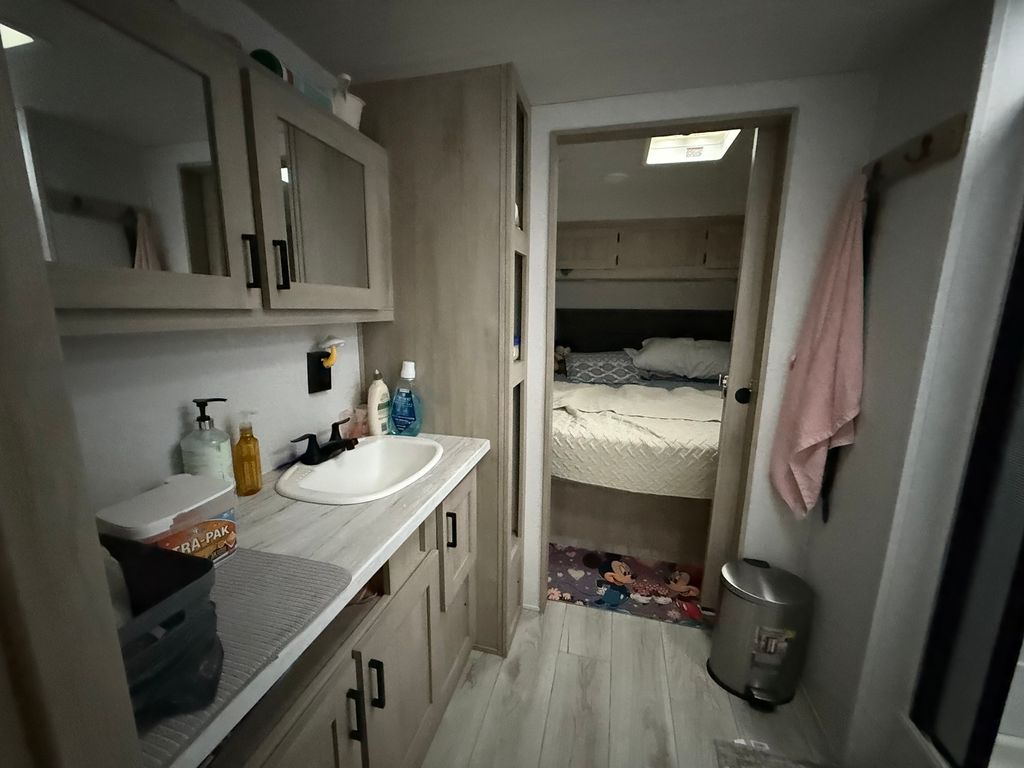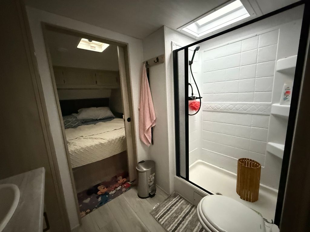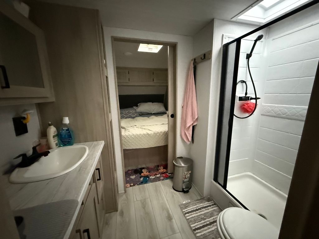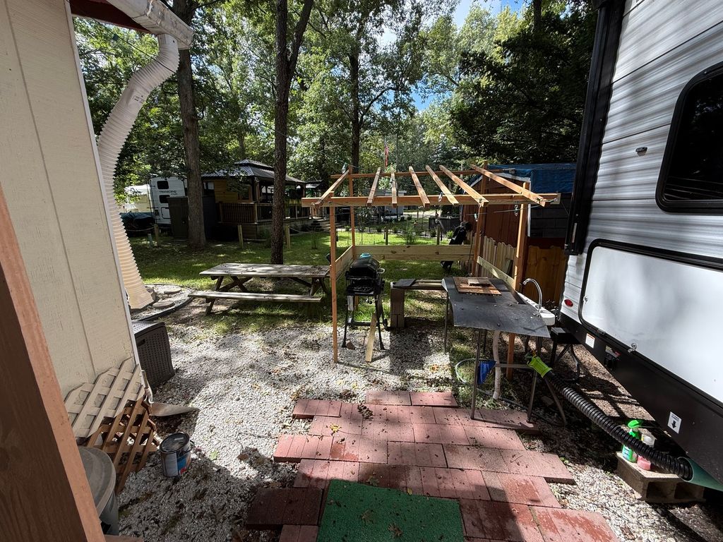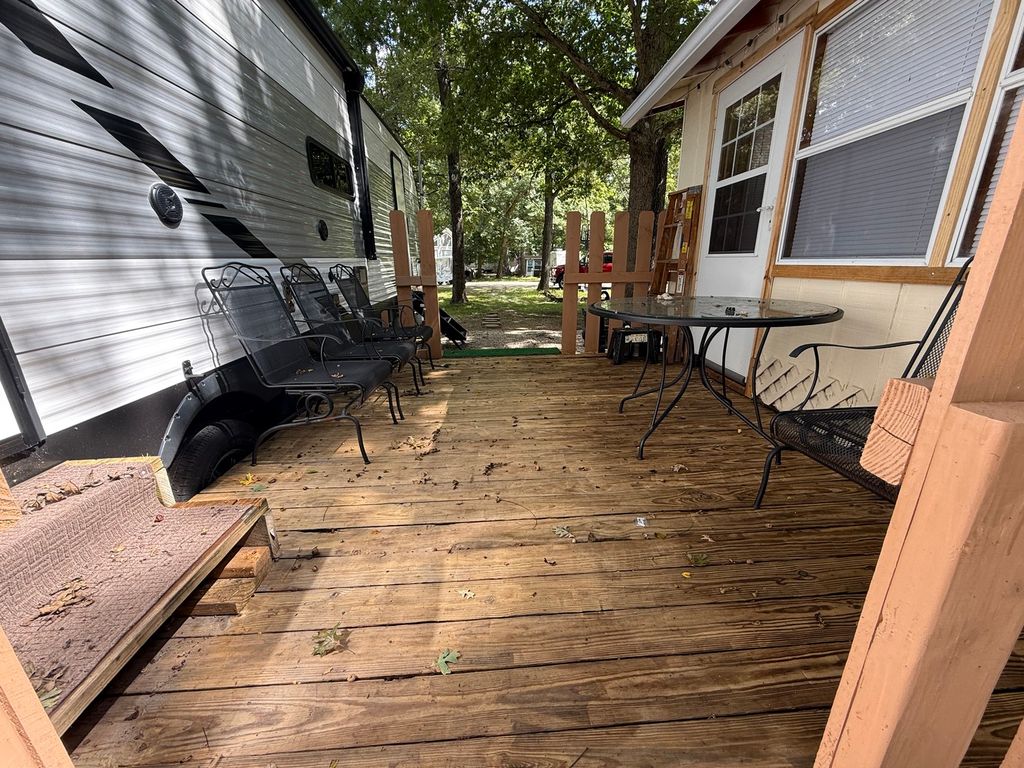 Stunning 2024 East to West Della Terra 300DB Travel Trailer, perfectly set up on a shaded, level lot near Bass Lake, Sunset Lake, the comfort station, and other great amenities. This modern travel trailer features beautiful finishes throughout and comes fully equipped with all appliances, plus two LP tanks for extended use. With plenty of room to sleep family and guests, the layout includes a private main bedroom, a bunk room, a converting dinette, a sofa, and a spacious room addition with new carpet and fresh paint (2025), offering even more sleeping space. For added convenience, the unit includes 1.5 bathrooms-one at each end. Outside, enjoy entertaining and relaxing with a large deck, an awning for shade, and an outdoor kitchen perfect for summer meals. A picnic table and fire pit area make outdoor gatherings even better. The property also includes extended utilities, thoughtful landscaping, a 10x10 storage shed, and even a boat and trailer-both included in the sale. Whether you're looking for a weekend retreat or a seasonal getaway, this turn-key setup has everything you need to start making memories right away. Please note that Woodhaven Lakes is a gated recreational community and cannot be used as a primary residence or homestead. You must be accompanied by a broker to view any properties, YOU CANNOT ACCESS THE CAMPGROUND WITHOUT A PASS. The property owner pays the association fees.